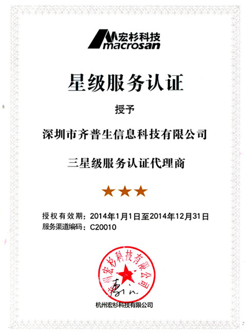2013年12月,齊普生公司再傳喜訊:榮獲杭州宏杉科技有限公司(以下簡(jiǎn)稱:宏杉科技)三星級(jí)服務(wù)認(rèn)證代理商資格證書(shū)!